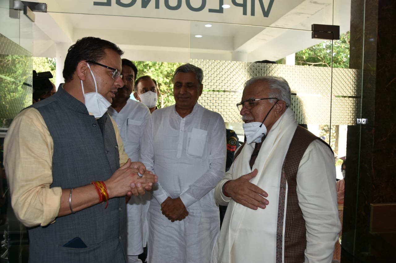 देहरादून । मुख्यमंत्री पुष्कर सिंह धामी ने गुरूवार को सहस्त्रधारा हेलीपेड पर हरियाणा के मुख्यमंत्री मनोहर लाल खट्टर से भेंट की। हरियाणा के मुख्यमंत्री मनोहर लाल खट्टर मसूरी से हरियाणा वापस जाते समय सहस्त्रधारा हेलीपैड पर रूके जहां पर मुख्यमंत्री पुष्कर सिंह धामी ने उनका स्वागत किया तथा विभिन्न समसामयिक विषयों पर उनसे चर्चा की।